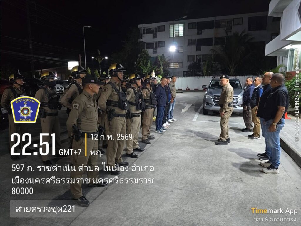 ผู้สื่อข่าวรายงานว่าตั้งแต่วันที่ 9 ก.พ. – 14 ก.พ. 2569 ที่ผ่านมา ภายใต้อำนวยการของ พล.ต.ต.พรชัย ขจรกลิ่น รอง ผบช. ภ.8 รรท.ผบก.ภ.จว.นครศรีธรรมราช พ.ต.อ.จักรวรรดิ บุญทวีกุลสวัสดิ์ รอง ผบก.ภ.จว.นครศรีธรรมราช พ.ต.อ.ขจิตร คงปราบ รอง ผบก.ภ.จว.นครศรีธรรมราช พ.ต.อ.รังสรรค์ สุขเกื้อ รอง ผบก.ภ.จว.นครศรีธรรมราช พ.ต.อ.นัษฐวุฒิ ทองทิพย์ รอง ผบก.ภ.จว.นครศรีธรรมราช พ.ต.อ.สุทัศน์ สงสยม รอง ผบก.ภ.จว.นครศรีธรรมราช พ.ต.อ.สงบ จันทร์สิงห์ รอง ผบก.ภ.จว.นครศรีธรรมราช พ.ต.อ.กิตติชัย ไกรนรา ผกก.สภ.เมือง นศ. พ.ต.ท.นรากร เอียดช่วย รอง ผกก.ป.สภ.เมือง นศ. สั่งการให้ พ.ต.ต.สรยุทธ์ สุวรรณโชติ สวป.สภ.เมืองนครศรีธรรมราช พร้อมด้วย เจ้าหน้าตำรวจ สภ.เมืองนครศรีธรรมราช