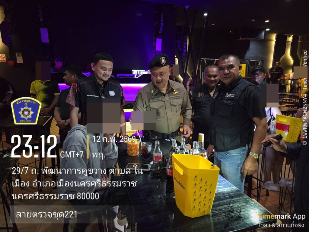 ลงพื้นที่ปฏิบัติการตามนโยบายรัฐบาล “NO Drugs NO Dealers” ผนึกกำลังหมู่บ้านและชุมชน สร้างพื้นที่ปลอดยาเสพติด ปลอดผู้ค้าและผู้เสพยาเสพติด เจ้าหน้าที่ได้เข้าตรวจสอบร้านอาหาร สถานบันเทิง ผับ บาร์ ในพื้นที่ อ.เมือง จ.นครศรีธรรมราช ตรวจสอบใบอนุญาตจำหน่ายสุรา และใบอนุญาตประกอบกิจการ พบว่าผู้ประกอบการมีใบอนุญาตถูกต้องตามกฎหมาย ไม่พบเยาวชนอายุต่ำกว่า 20 ปีบริบูรณ์เข้าใช้บริการ และไม่พบสิ่งของผิดกฎหมายแต่อย่างใด